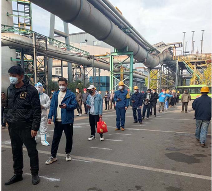 “核酸檢測(cè)人員,自覺保持2米距離、戴好口罩”10月12日上午,在公司綜合樓門前,行政處、分廠安全員、核算員積極協(xié)調(diào)核酸檢測(cè)現(xiàn)場(chǎng)秩序,在配合醫(yī)護(hù)人員開展檢測(cè)工作的同時(shí),做好防疫宣傳工作。前來進(jìn)行核酸檢測(cè)的職工在現(xiàn)場(chǎng)排起長龍,積極配合工作人員的指揮。