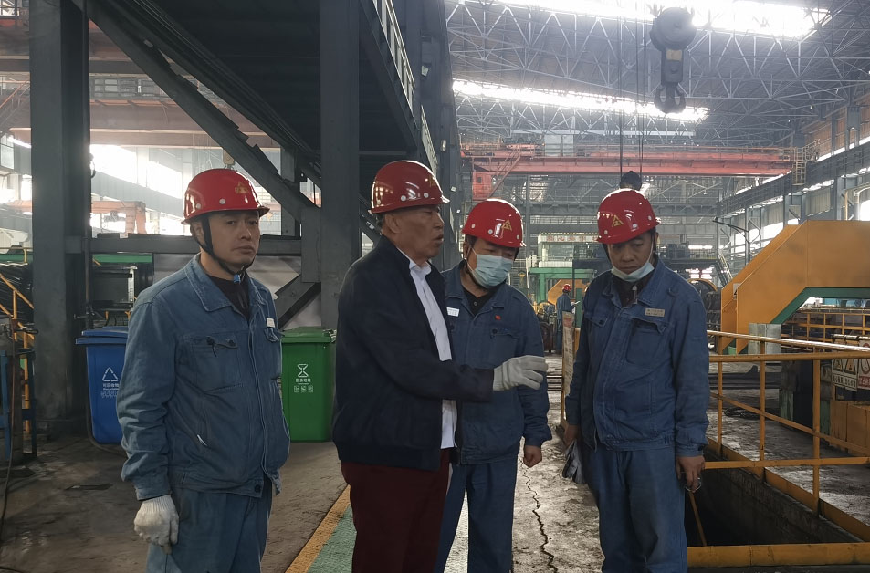 董事長(左二)在軋鋼廠檢修現(xiàn)場視察,公司副總經(jīng)理路士洪(右二)、軋鋼廠廠長馬振廣(右一)、軋鋼廠成品車間副主任李樹生(左一)等主要領(lǐng)導全程陪同