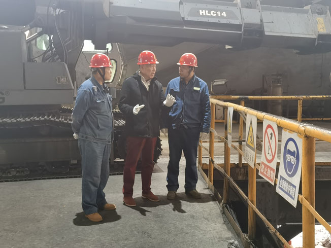 董事長(左二)在煉鋼廠檢修現(xiàn)場視察,公司副總調(diào)度長李成哲(左一)、煉鋼廠廠長閆海龍(右一)等主要領(lǐng)導全程陪同